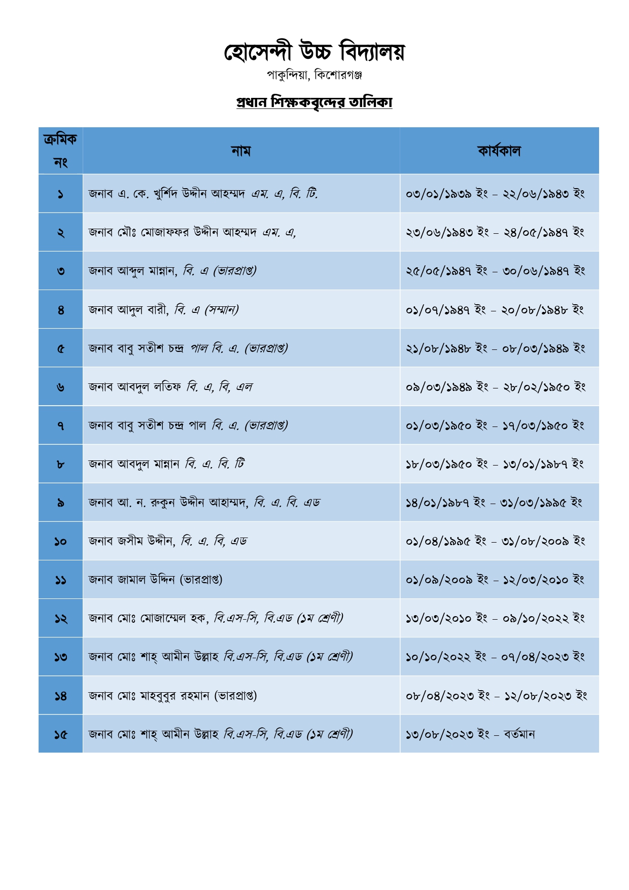 প্রধান শিক্ষকবৃন্দের তালিকা